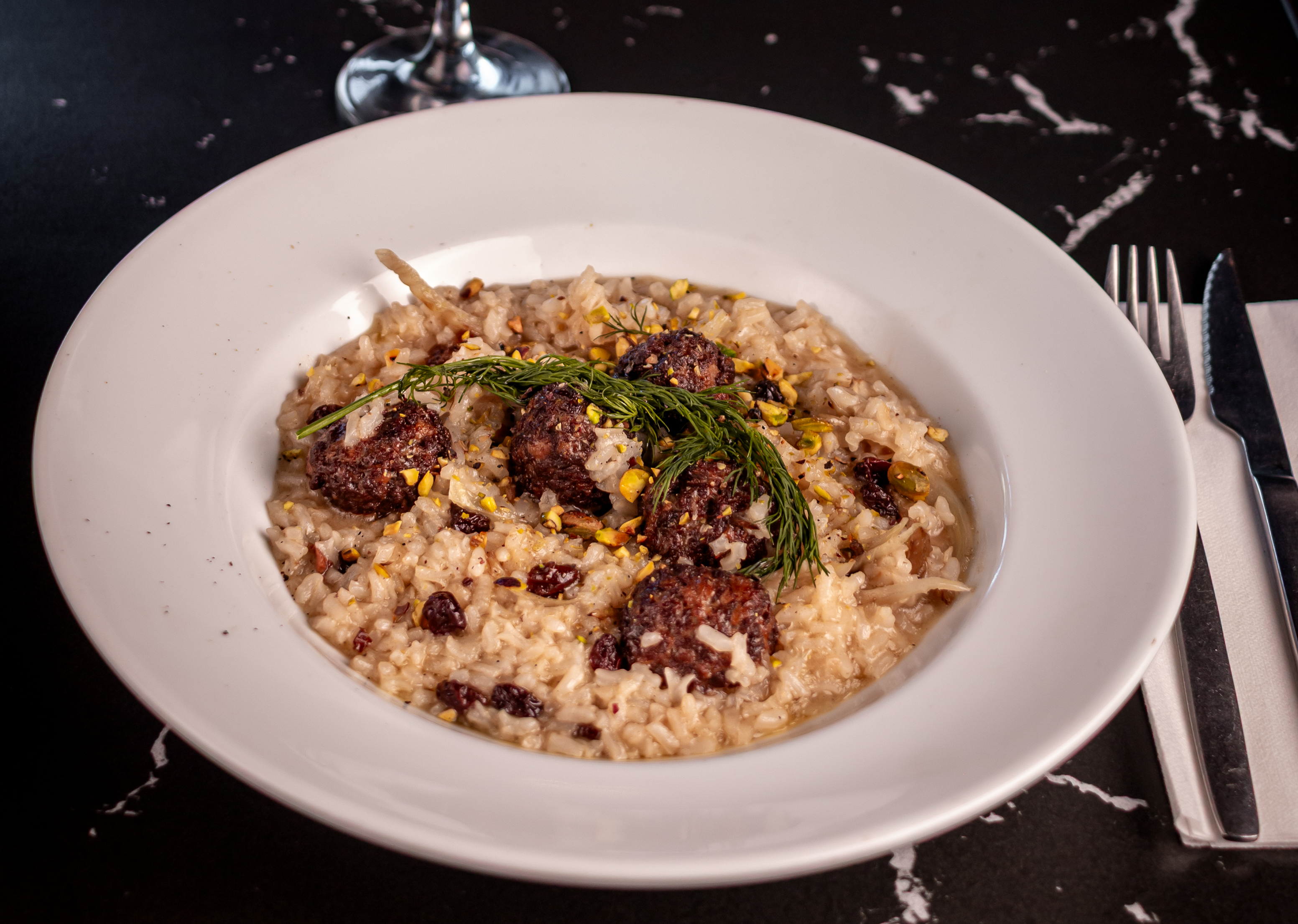 POLPETTINA DE CORDERO CON RISOTTO, HINOJO, PASAS Y PISTACHO EN HIERRO
